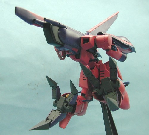 本体との接続部分を挟み込みからポリキャップにしたのは先ほど述べた通り テイルスタビライザーも同様に挟み込みから挟み込みの軸が3mmなのでローリングジョイントの大きい奴に取替え、テイルスタビライザーの接続部分は切断して3mmの軸にしました テイルスタビライザーの接続部分の肉抜きはポリパテで埋めて置くと見栄えがいいですし ノズルはテイルスタビライザーに接続するのを止めてテイルスタビライザーにプラ板で台座を作ってそこに接続、ちなみテイルスタビライザーの上の合わせ目は消し難いので、穴を空けたプラ板を貼ってディティールっぽくして誤魔化してます MS形態時には隙間が目立つのでMA形態の時に体や頭部が入り込む隙間にカバーを作り、これを複製して量産してあります